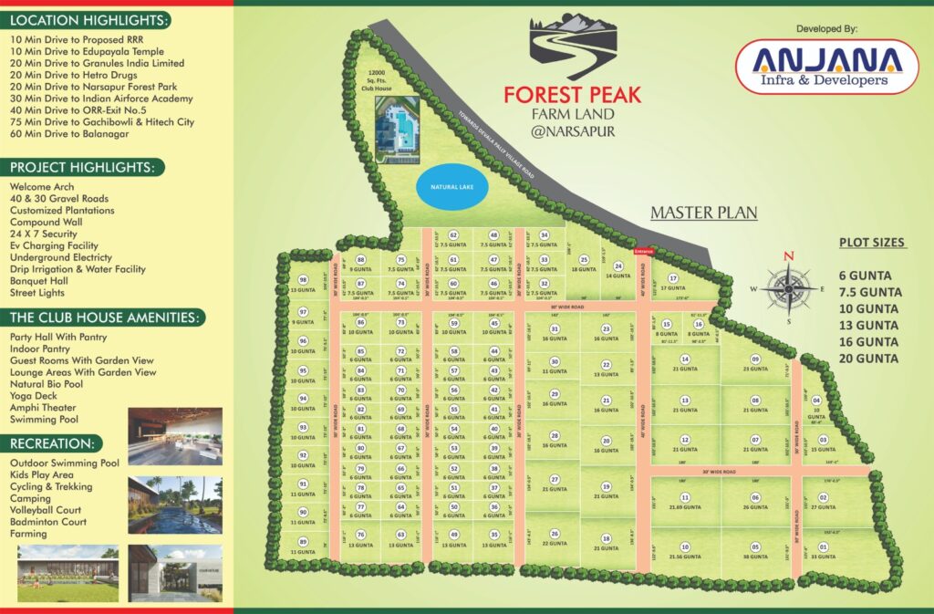 Conveniently located just a 10-minute drive away from Proposed RRR and Edupayala Temple, Forest Peak offers easy access to major landmarks and facilities. With Granules India Limited and Hetro Drugs only a 20-minute drive away, you’ll enjoy proximity to prominent industries. Embrace nature’s beauty at Narsapur Forest Park, located just a short drive from the project.